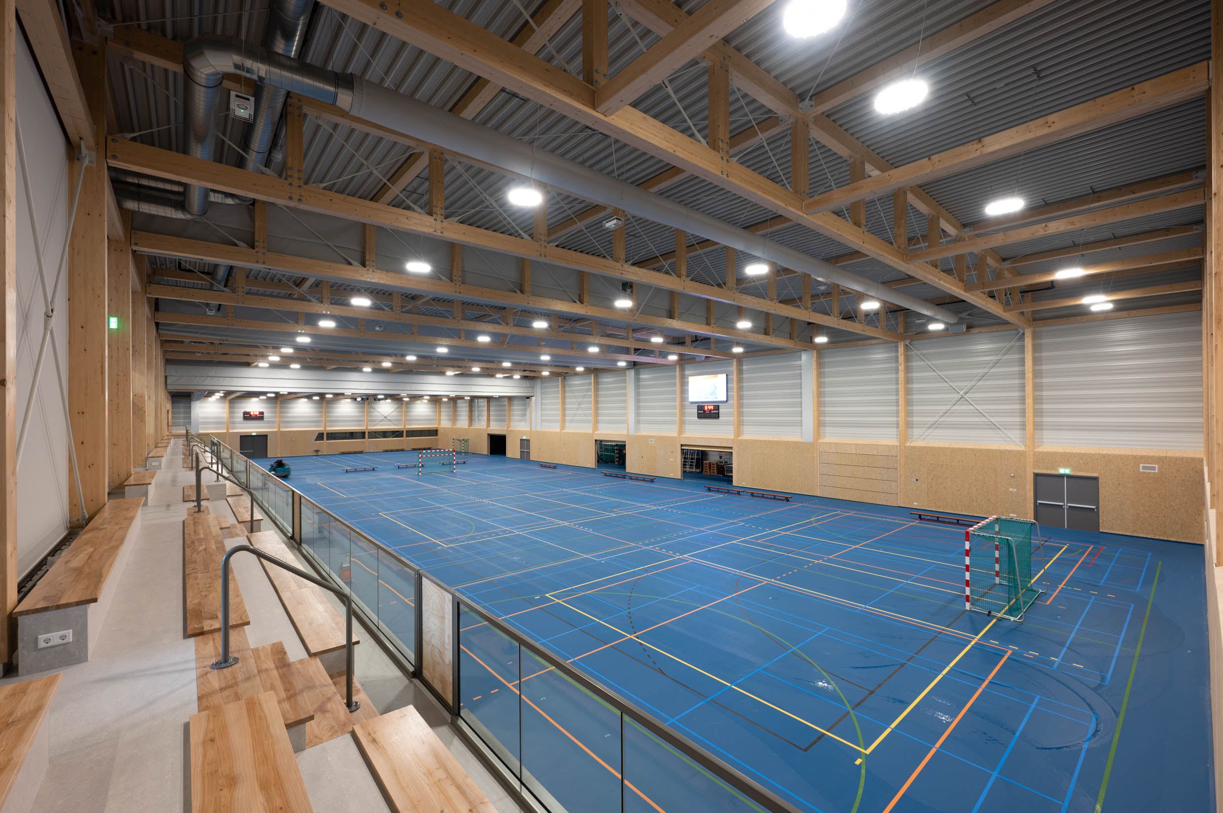 The structure of the sports halls is made of laminated timber trusses with laminated timber columns. These trusses span 31 meters in the large hall and 27 meters in the small hall. The diagonals in the timber trusses of the halls are made of tension rods, resulting in an elegant load-bearing structure with a warm and slender appearance, see Figure 2. Near the end walls of the hall, some trusses contain double tension rods that bear the upward wind loads. The trusses were fully assembled in the factory and transported to the construction site as a whole. The two halls are connected by a large truss, also made of laminated timber construction. This creates one large space. The roof is made of steel roof plates.
